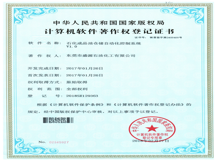 石化成品油分類存儲系統著作權登記證書Click for larger image